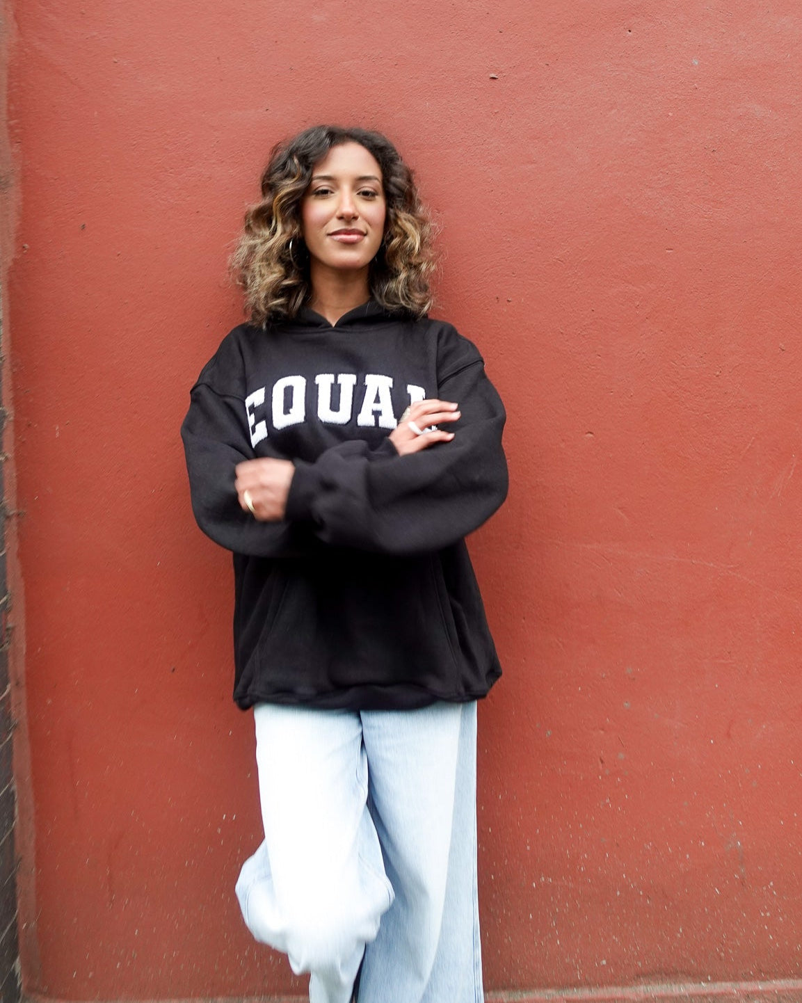 The bold EQUAL lettering on the front adds a cool touch, while the cuffed wrists and waistband keep everything snug. Perfect for anyone looking for a relaxed, unisex hoodie that’s as comfortable as it is eye-catching.